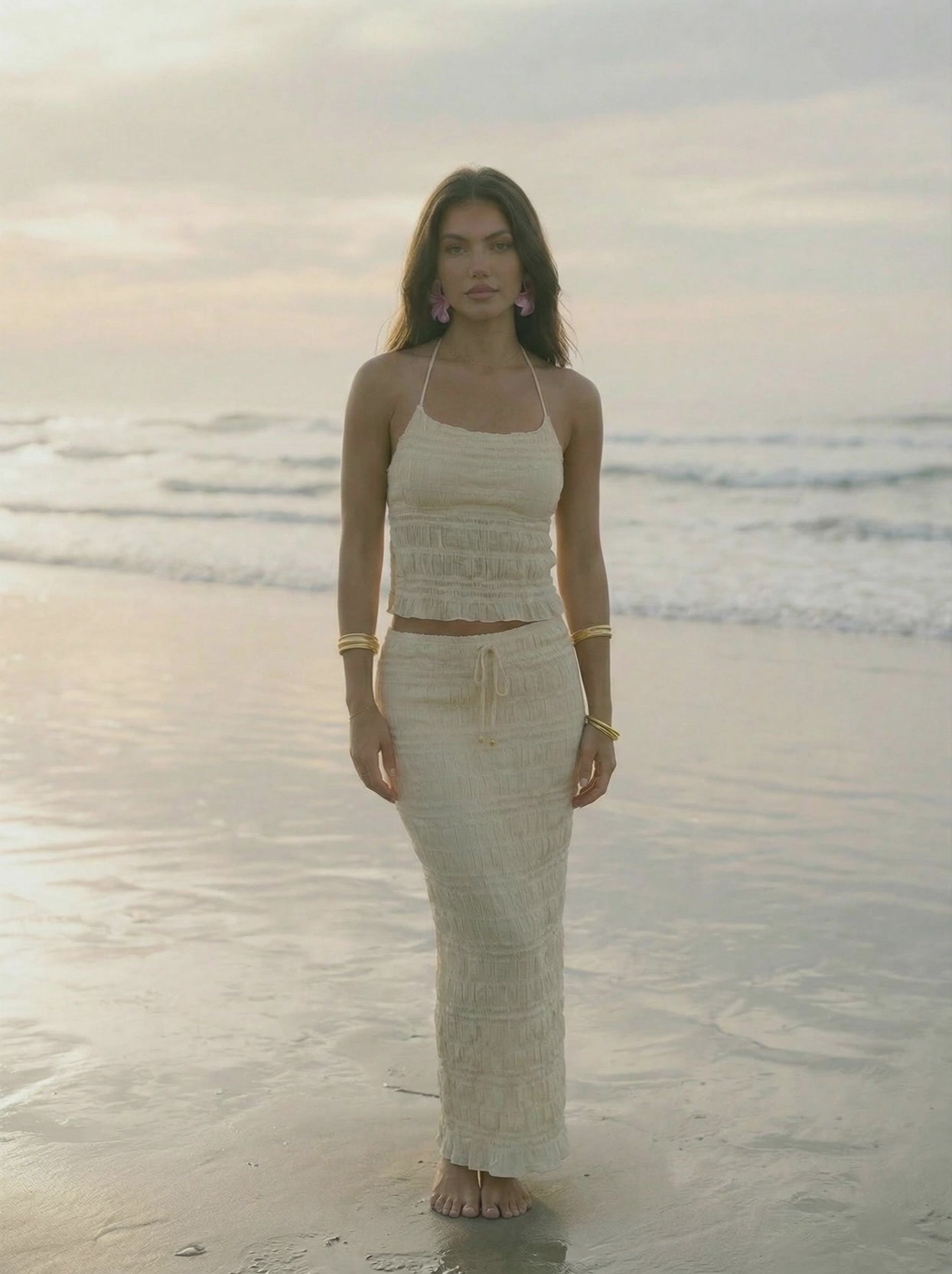Channel effortless island elegance ia chic, sculpting dress designed for resort dinners, summer escapes, and golden-hour cocktails. The cross-neck halter frames your shoulders beautifully, while the teardrop cut-out adds a soft, feminine touch.