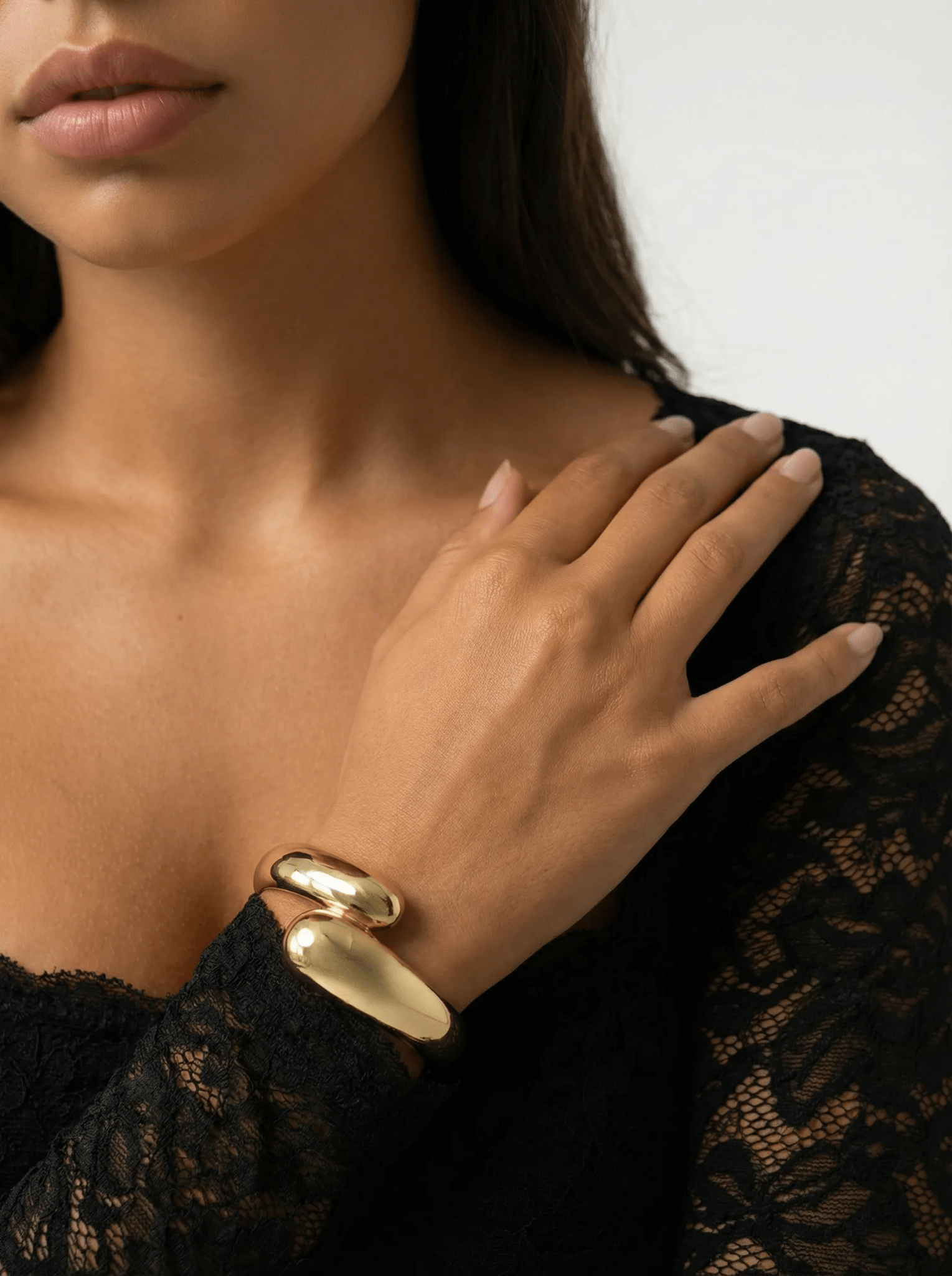The softly curved wrap design creates a striking yet balanced shape around the wrist, offering both structure and elegance. Finished with a discreet hinge closure for ease and comfort, Aurelia is the ultimate finishing touch — whether worn solo or layered for impact.
