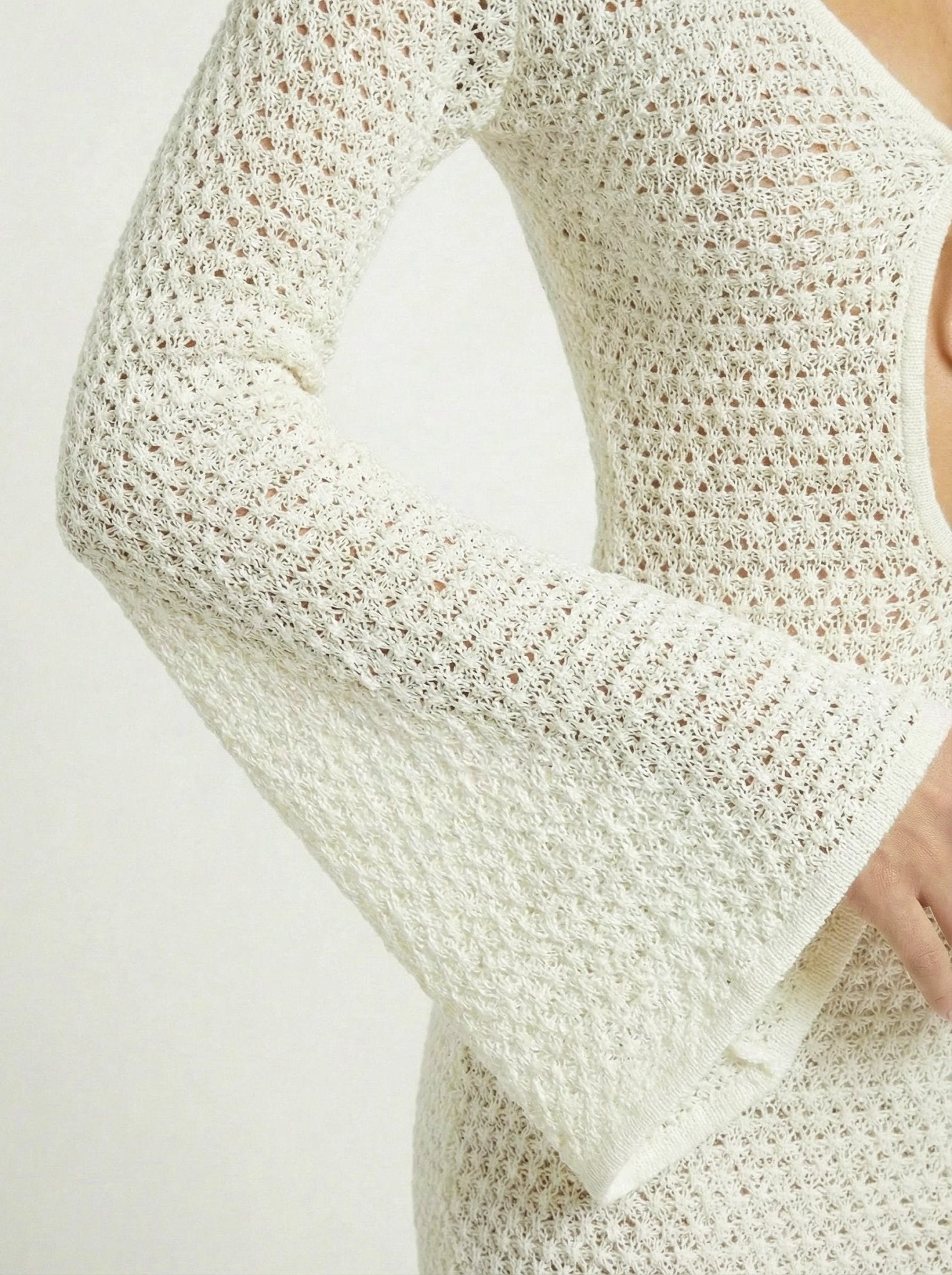 Crafted in a soft, open-knit fabrication, the Azure Coast Mini features a plunging neckline with adjustable front tie detailing, allowing for a custom, flattering fit. The long flared sleeves add fluid movement and a touch of drama, while the figure-skimming mini length balances allure with ease. Lightly sheer and breathable, this piece is designed to layer seamlessly over swim or style effortlessly from beach to sunset drinks.
