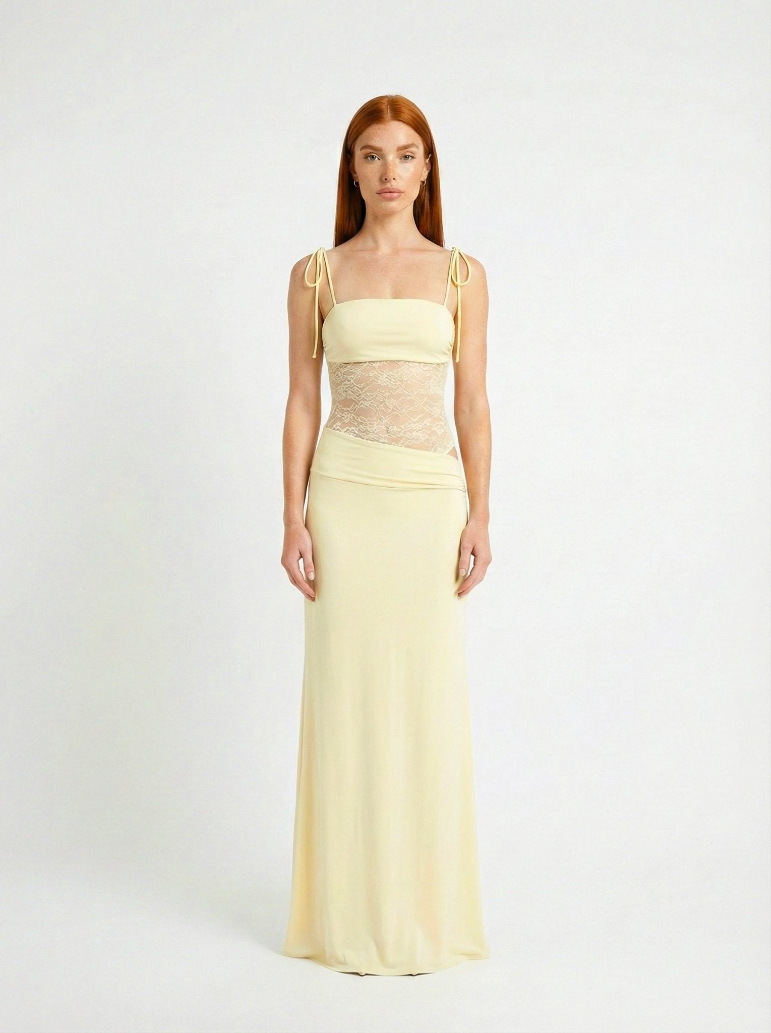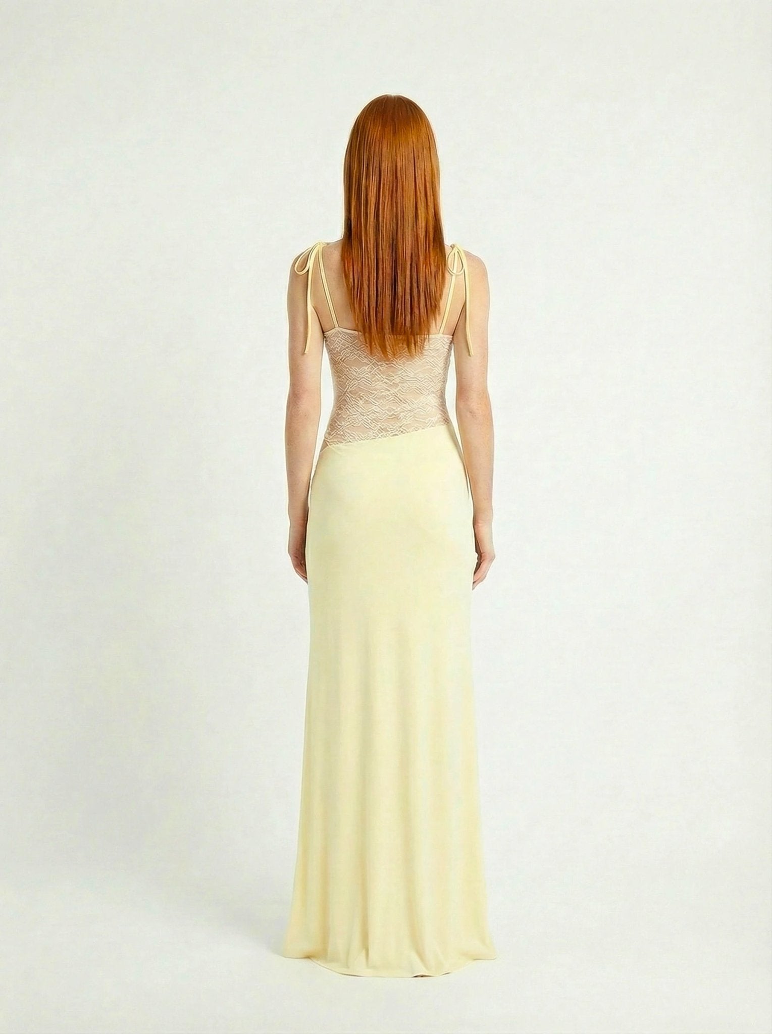 Featuring a softly structured bodice with delicate lace panelling through the waist, Meridian subtly defines the figure while maintaining a light, ethereal feel. The slim shoulder straps frame the neckline with simplicity, while the maxi skirt falls fluidly over the body, creating graceful movement with every step.