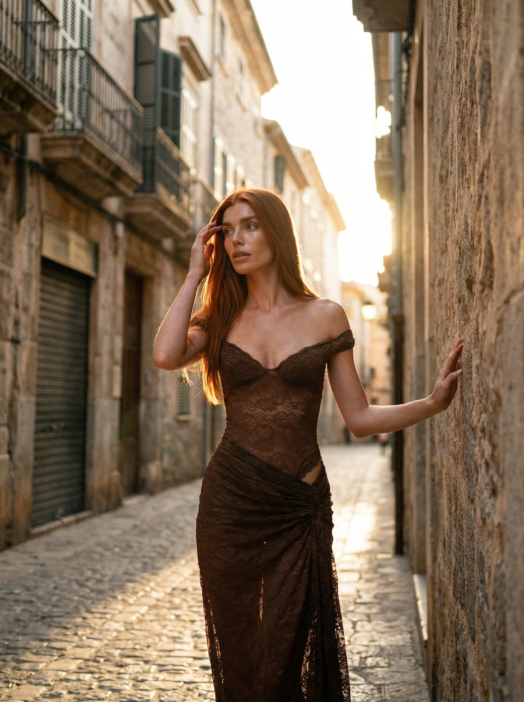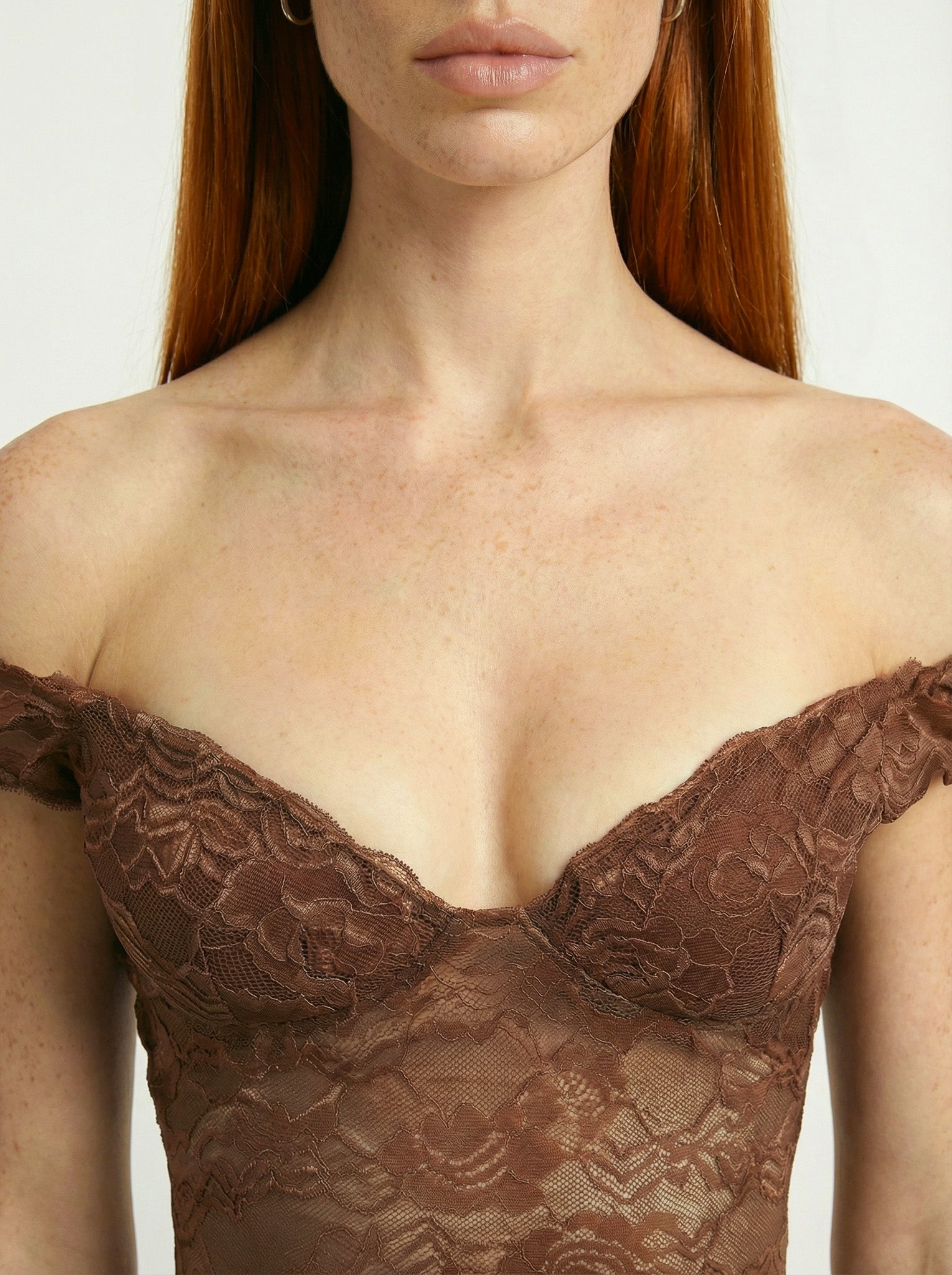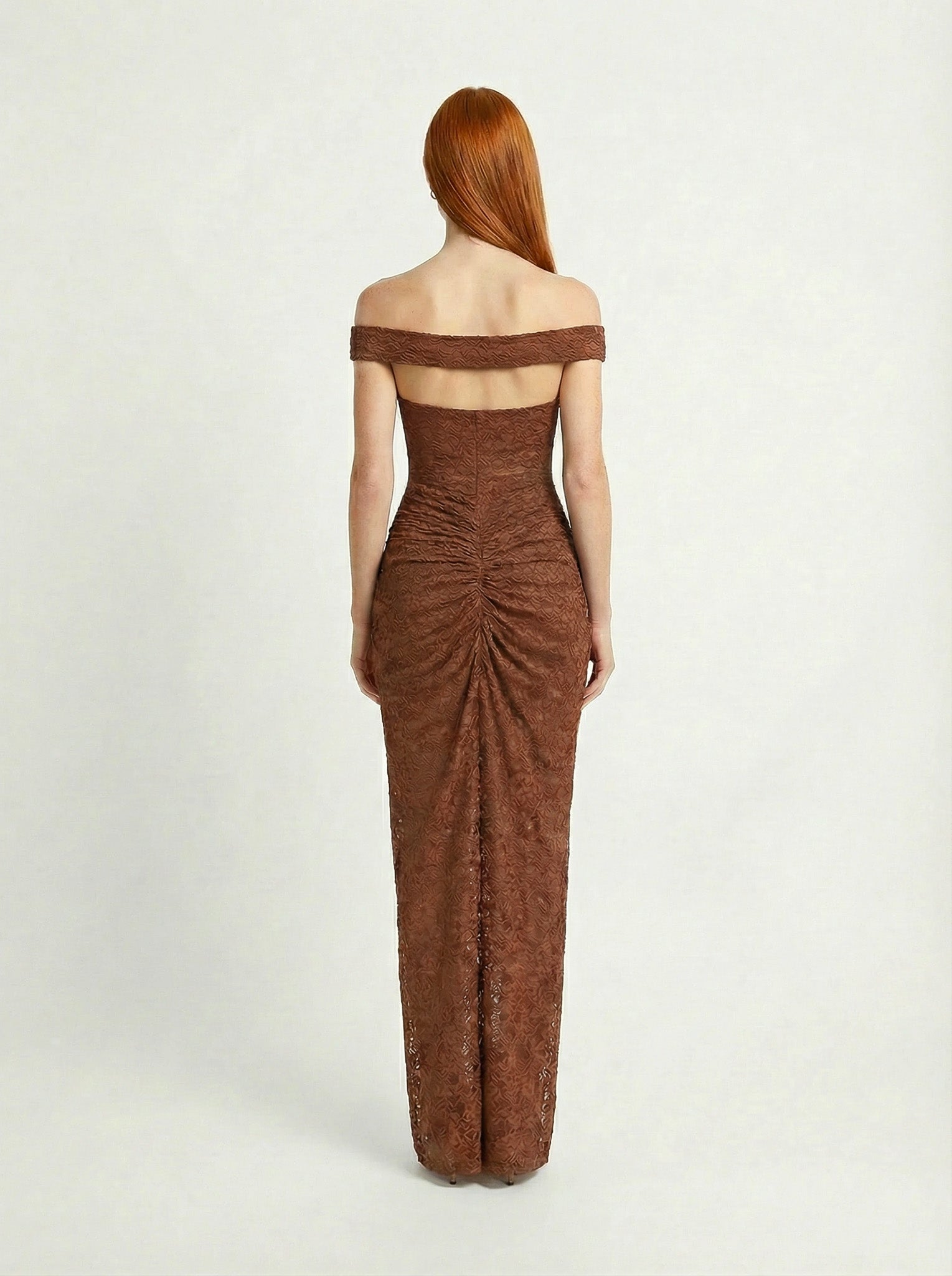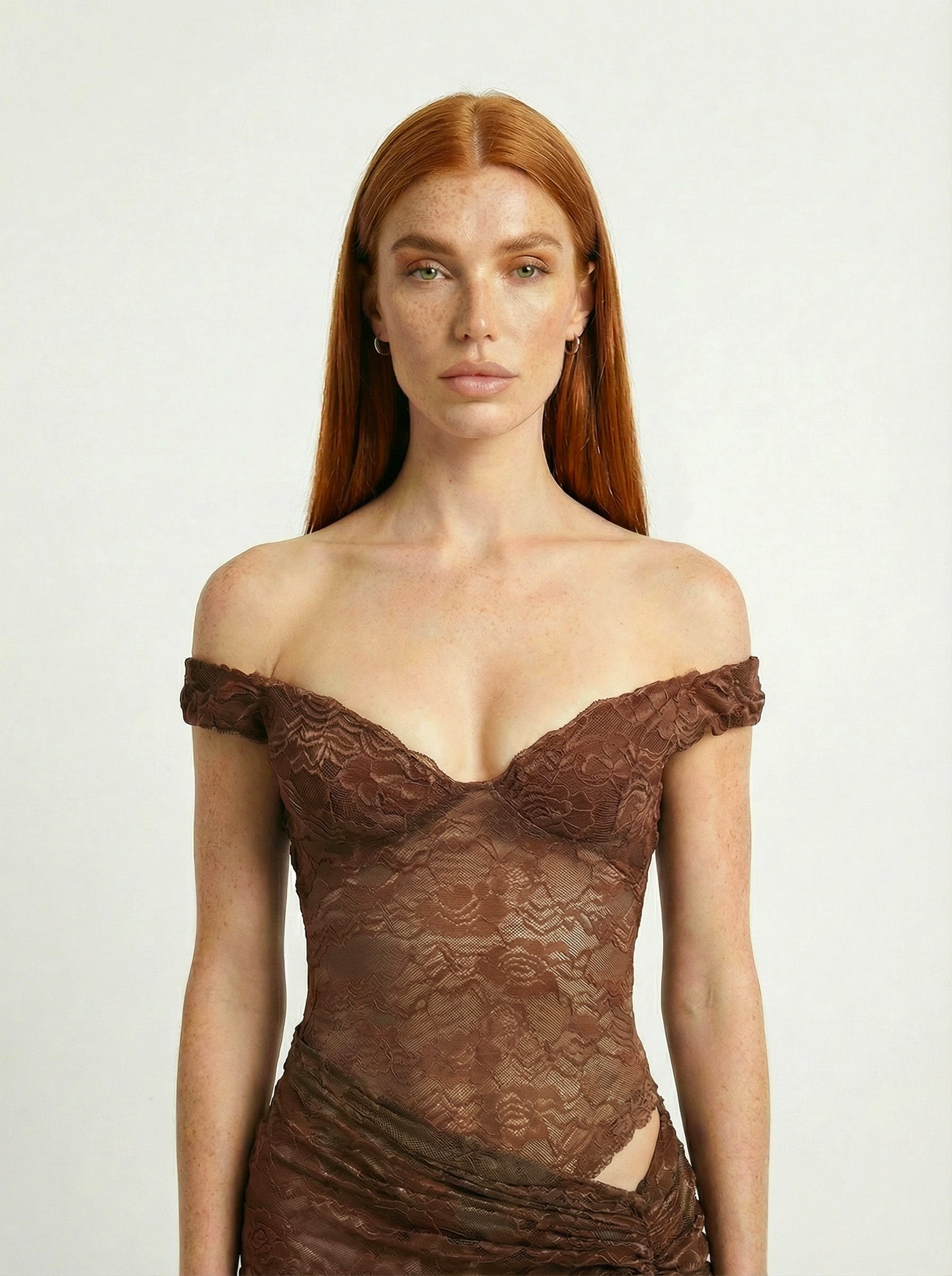 Warm, seductive, and effortlessly refined, the Café Noir Lace Dress is designed to captivate from golden hour through to moonlit evenings. Crafted in rich chocolate-toned lace, this off-shoulder silhouette exudes understated luxury with a distinctly European allure.