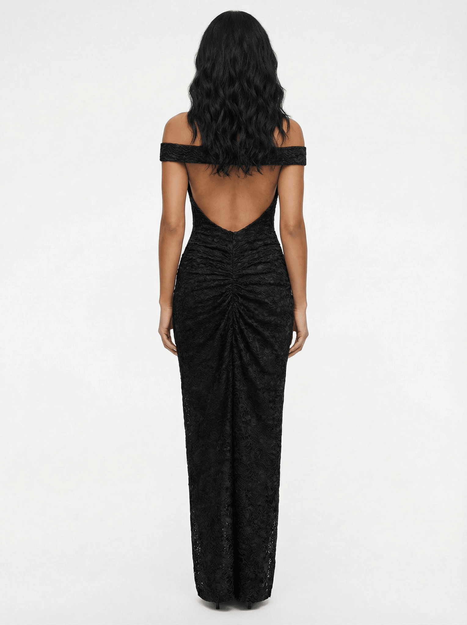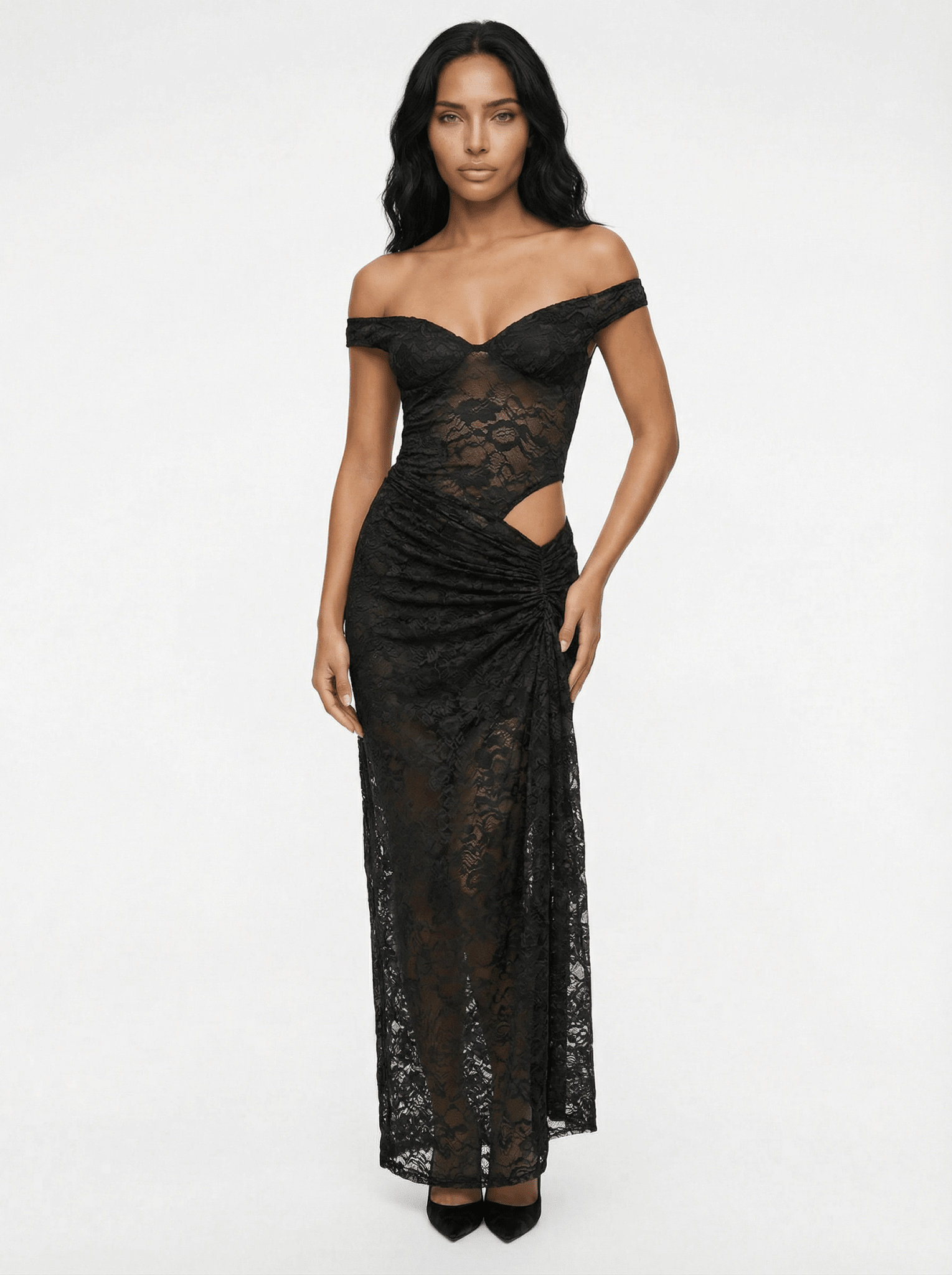 Featuring a softly draped off-the-shoulder neckline, the dress highlights the décolletage while the sheer lace bodice contours the body with a sensual, second-skin fit. Gentle ruching through the waist creates a flattering shape, while the semi-sheer finish adds depth and intrigue with every step.