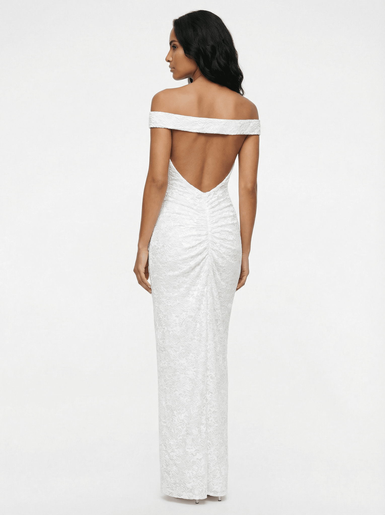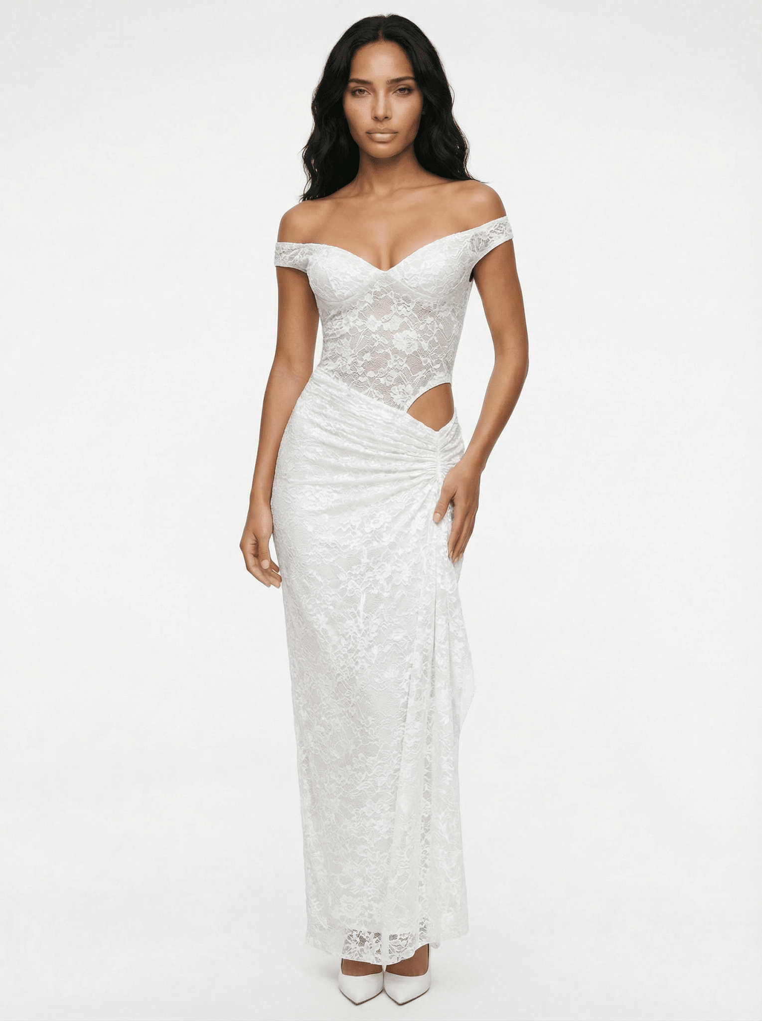 Featuring a softly draped off-the-shoulder neckline, the dress highlights the décolletage while the sheer lace bodice contours the body with a sensual, second-skin fit. Gentle ruching through the waist creates a flattering shape, while the semi-sheer finish adds depth and intrigue with every step.