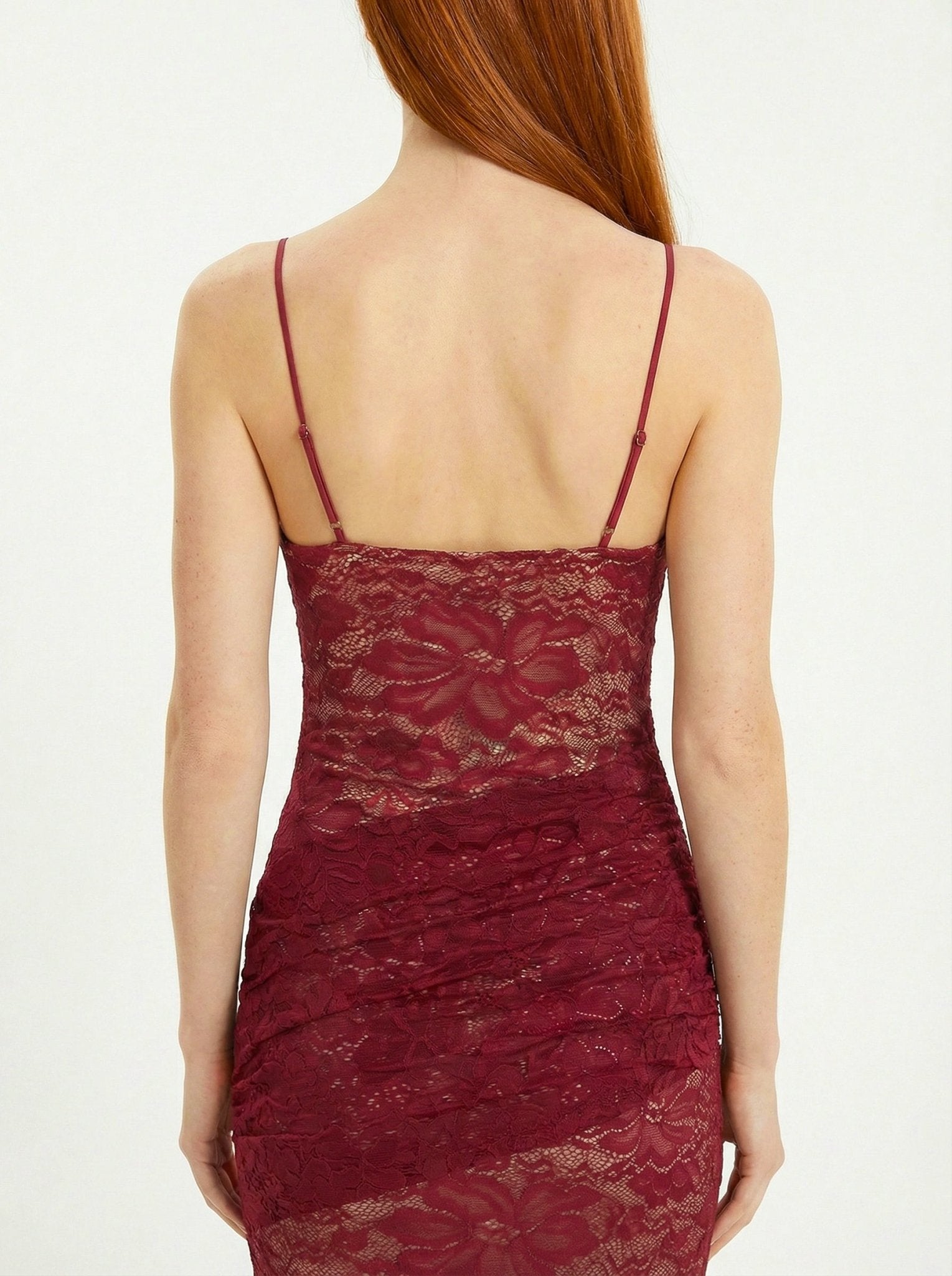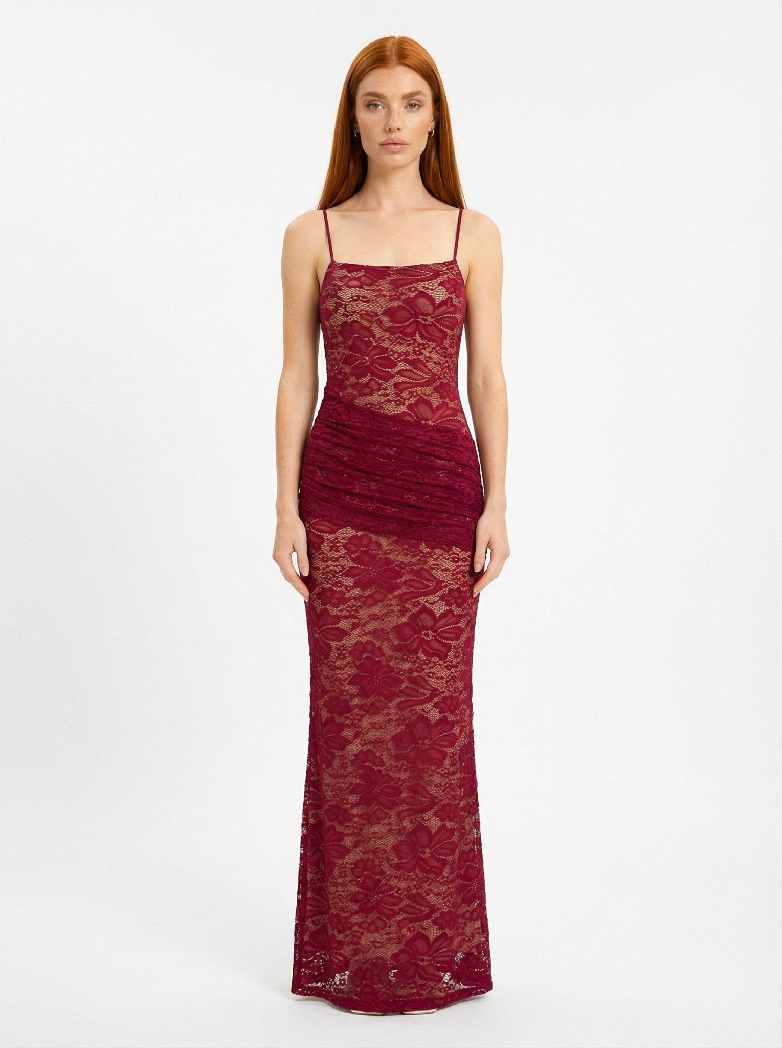 Crafted in an intricate lace fabrication, La Dolce Notte softly contours the body while remaining light and fluid. The slim shoulder straps frame the neckline with delicate simplicity, while subtle ruching through the waist enhances the natural shape, creating a sculpted yet effortless fit. The maxi length elongates the figure, flowing gracefully with every step.