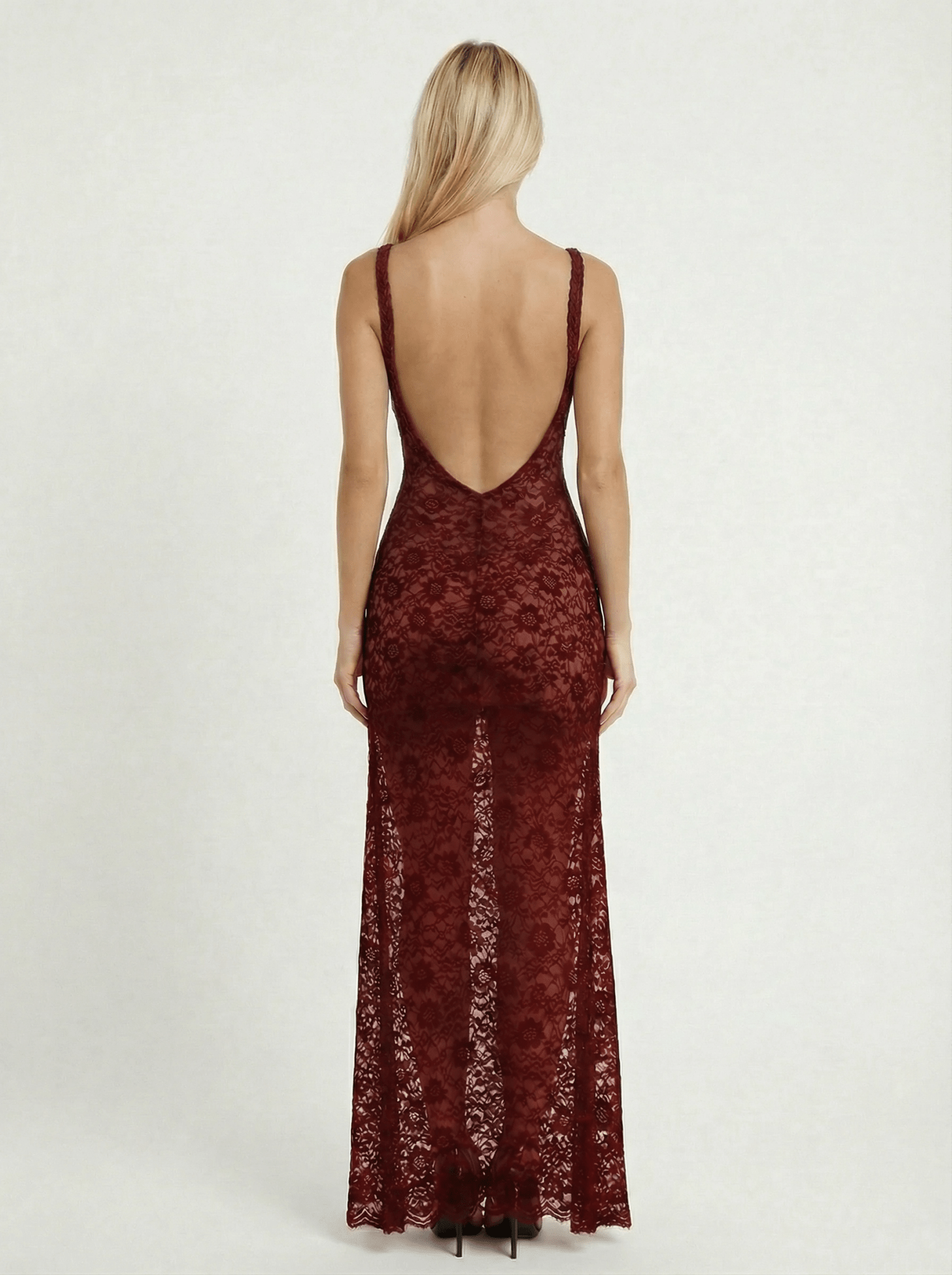 Sultry, timeless, and unapologetically feminine, the Noir Romance Dress is designed to make an entrance. Crafted in delicate Burgundy lace, this figure-skimming silhouette celebrates the body with a refined yet seductive edge.