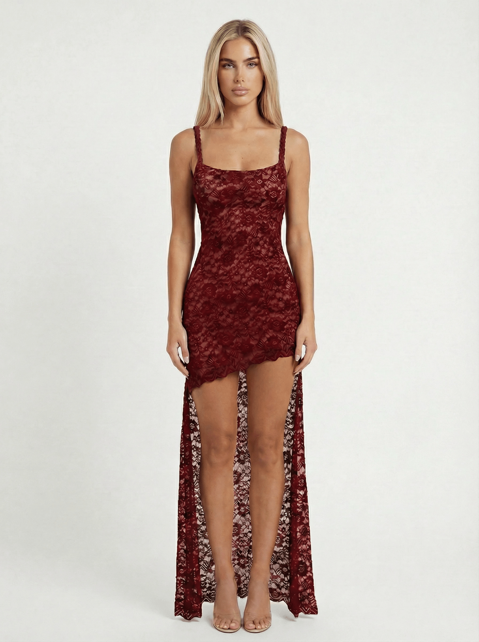 Featuring fine adjustable straps and a softly scooped neckline, the dress contours the frame effortlessly while the sheer lace overlay adds depth and intrigue. A subtle scalloped hem with an elegant extended lace finish creates movement and drama, perfect for evenings that call for something unforgettable.
