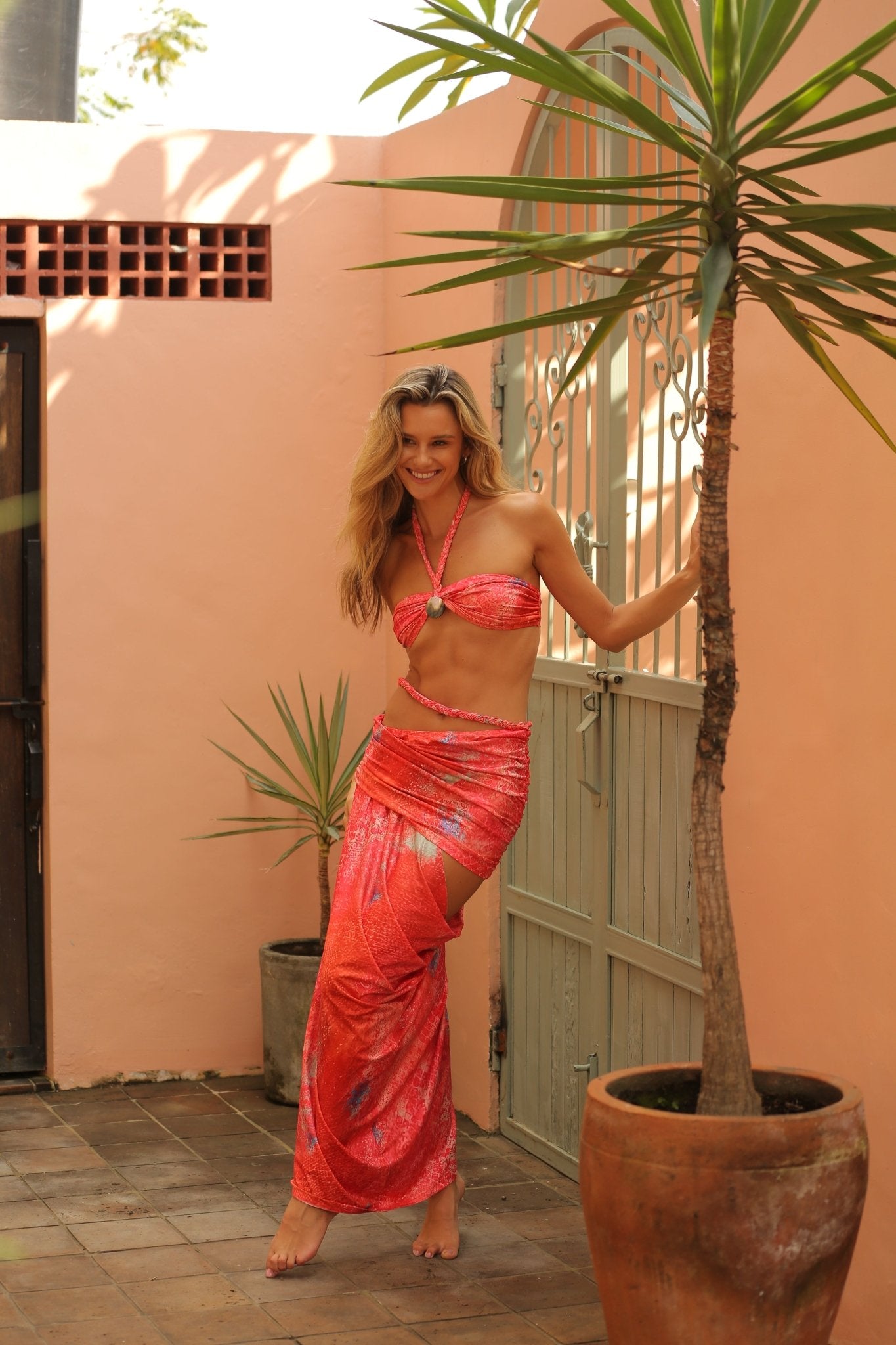 The bandeau-style top is anchored by braided straps and a sculptural shell centre, drawing the eye with subtle intrigue. The coordinating maxi skirt wraps the hips with intention, falling long and fluid for a silhouette that feels both effortless and commanding.